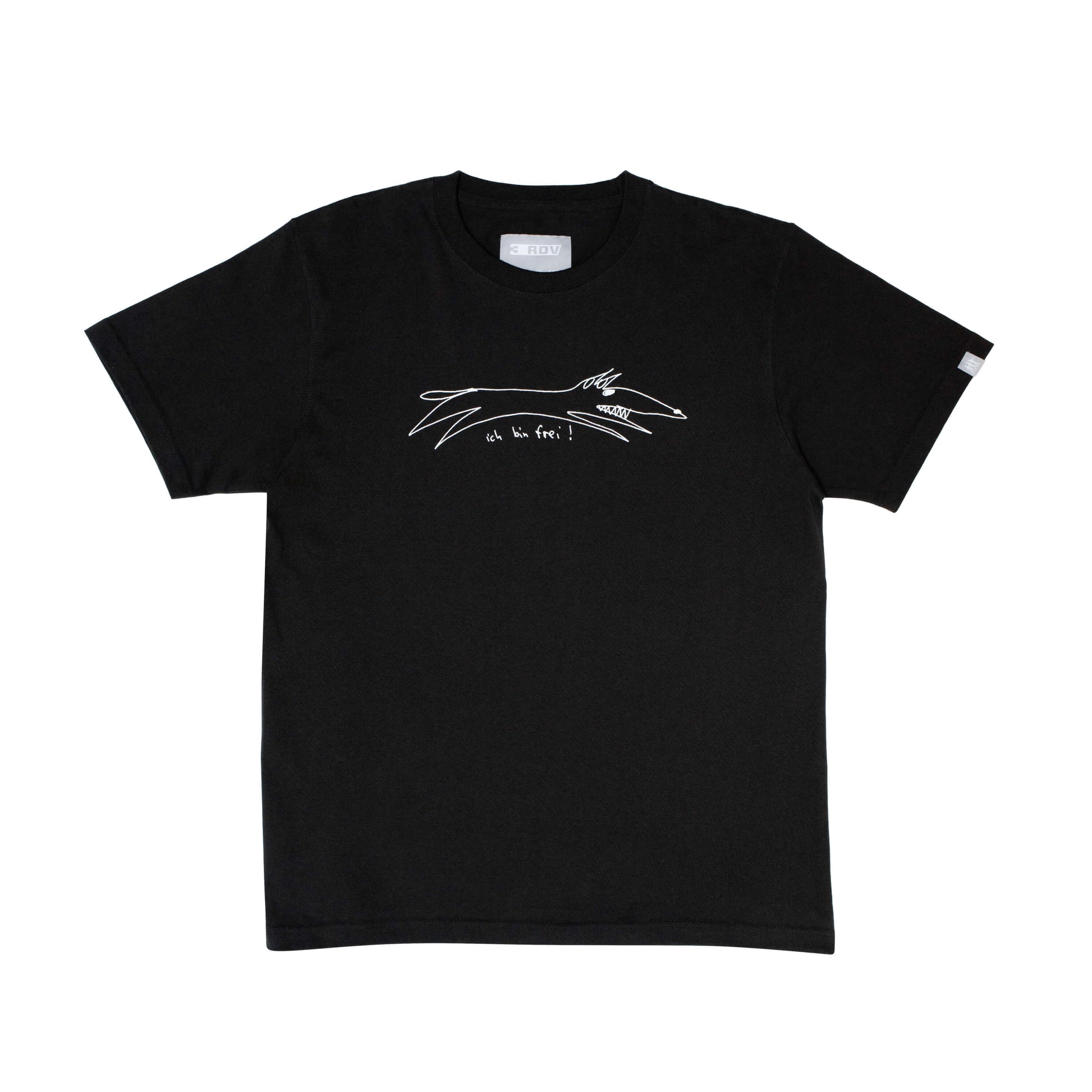 Front: a motif from Ralf Ostereich’s archival drawings (1982–1995), showing a dog leaping over the words Ich Bin Frei, created in homage to the late artist David Boysen.