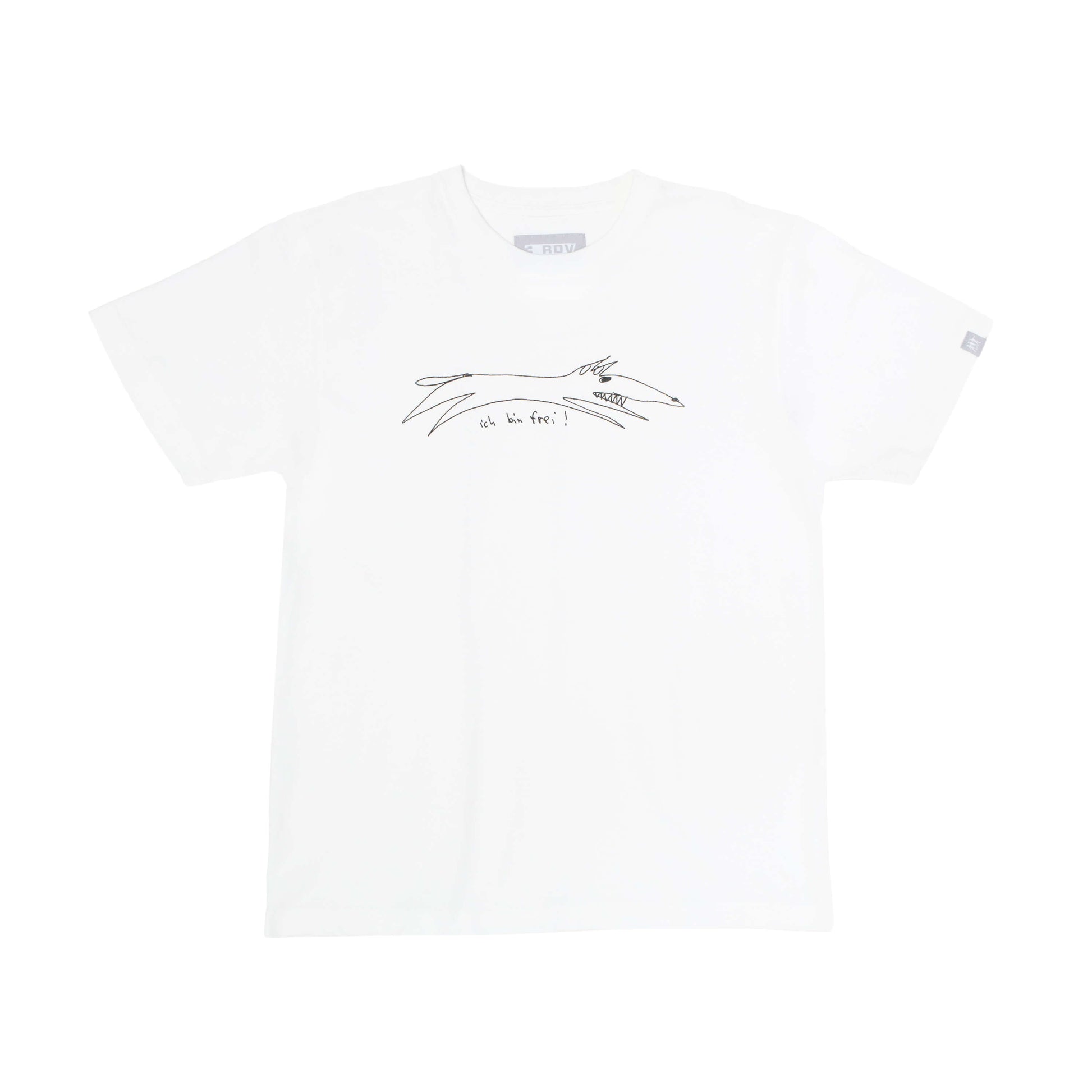 Front: a motif from Ralf Ostereich’s archival drawings (1982–1995), showing a dog leaping over the words Ich Bin Frei, created in homage to the late artist David Boysen.