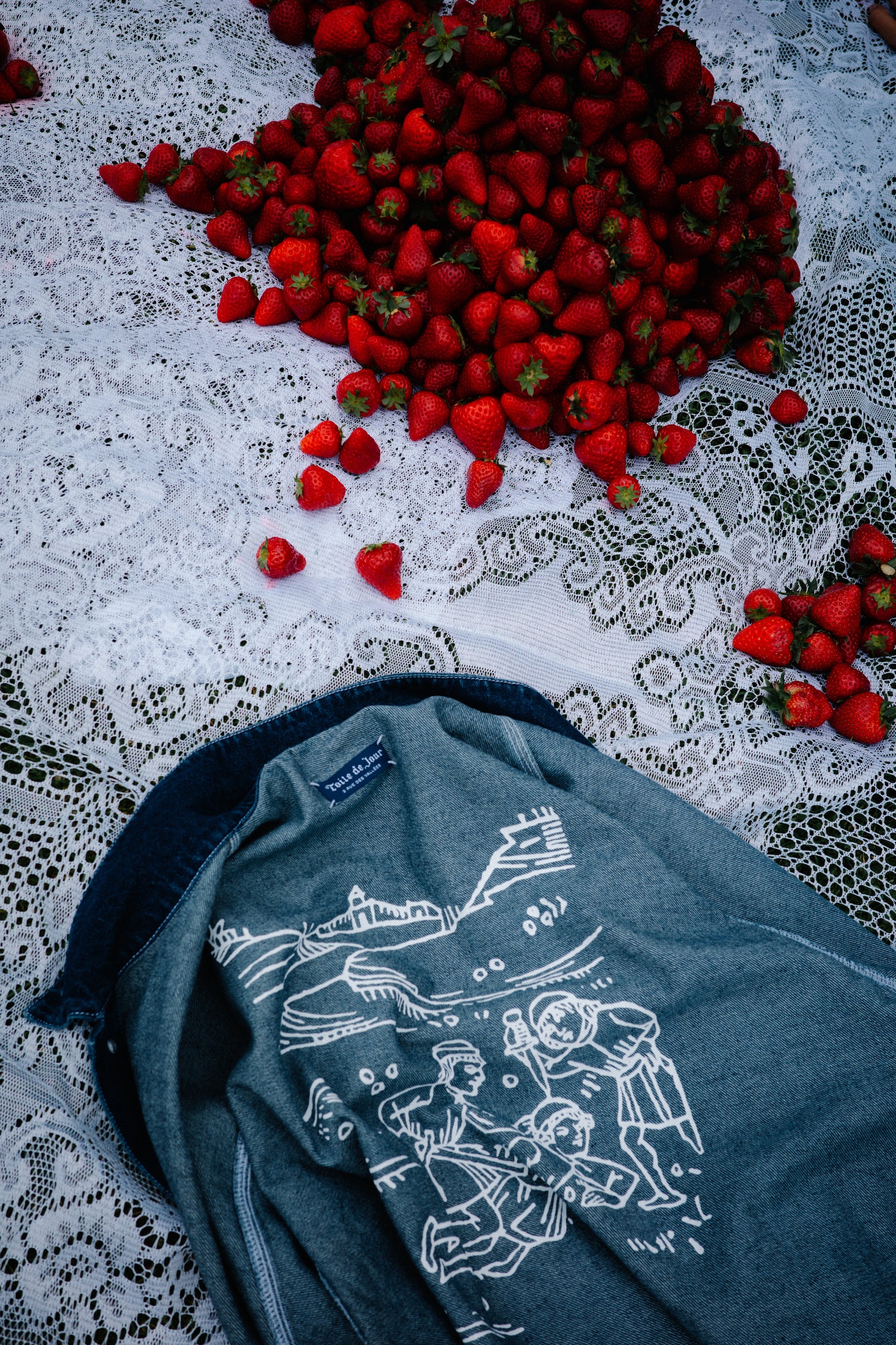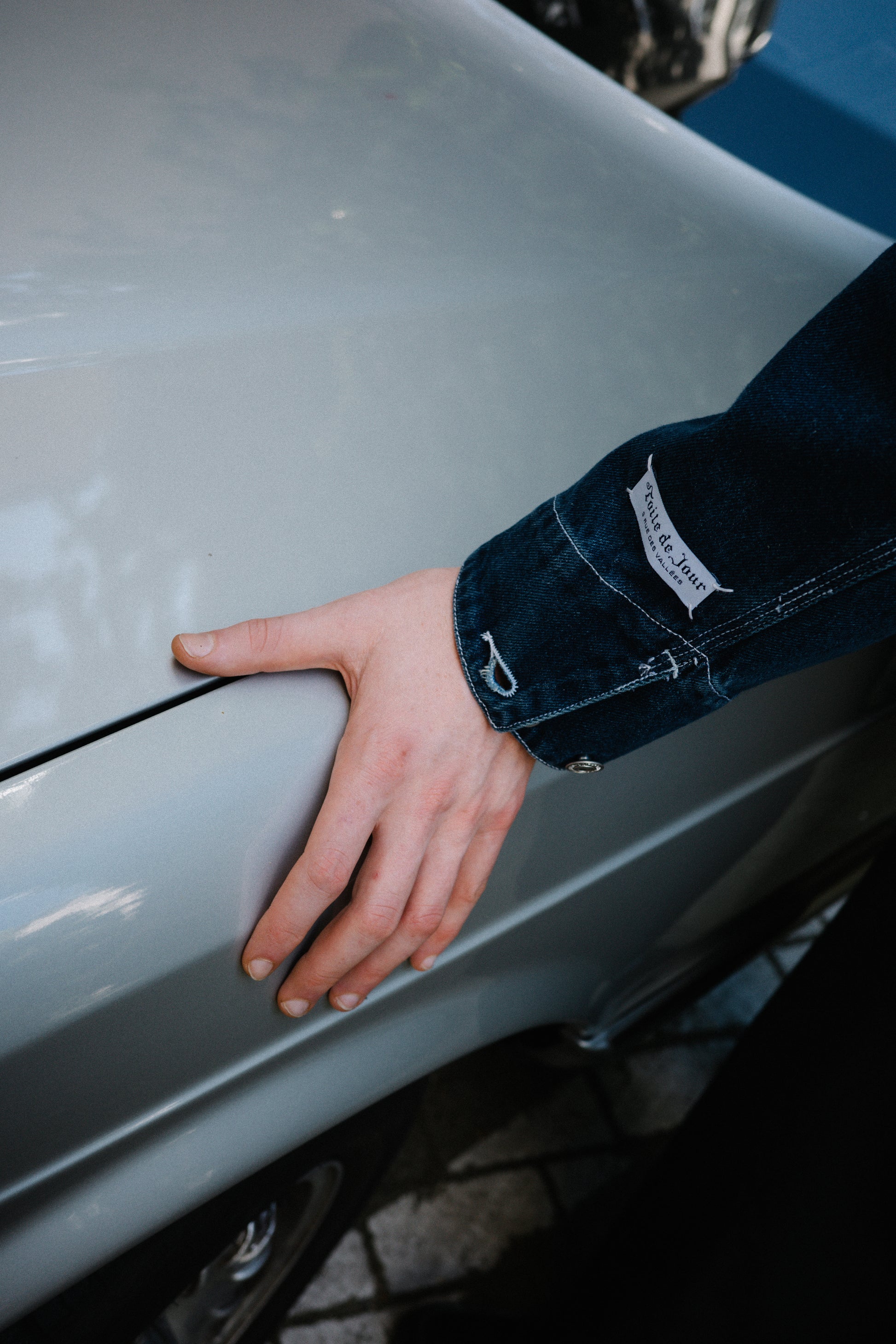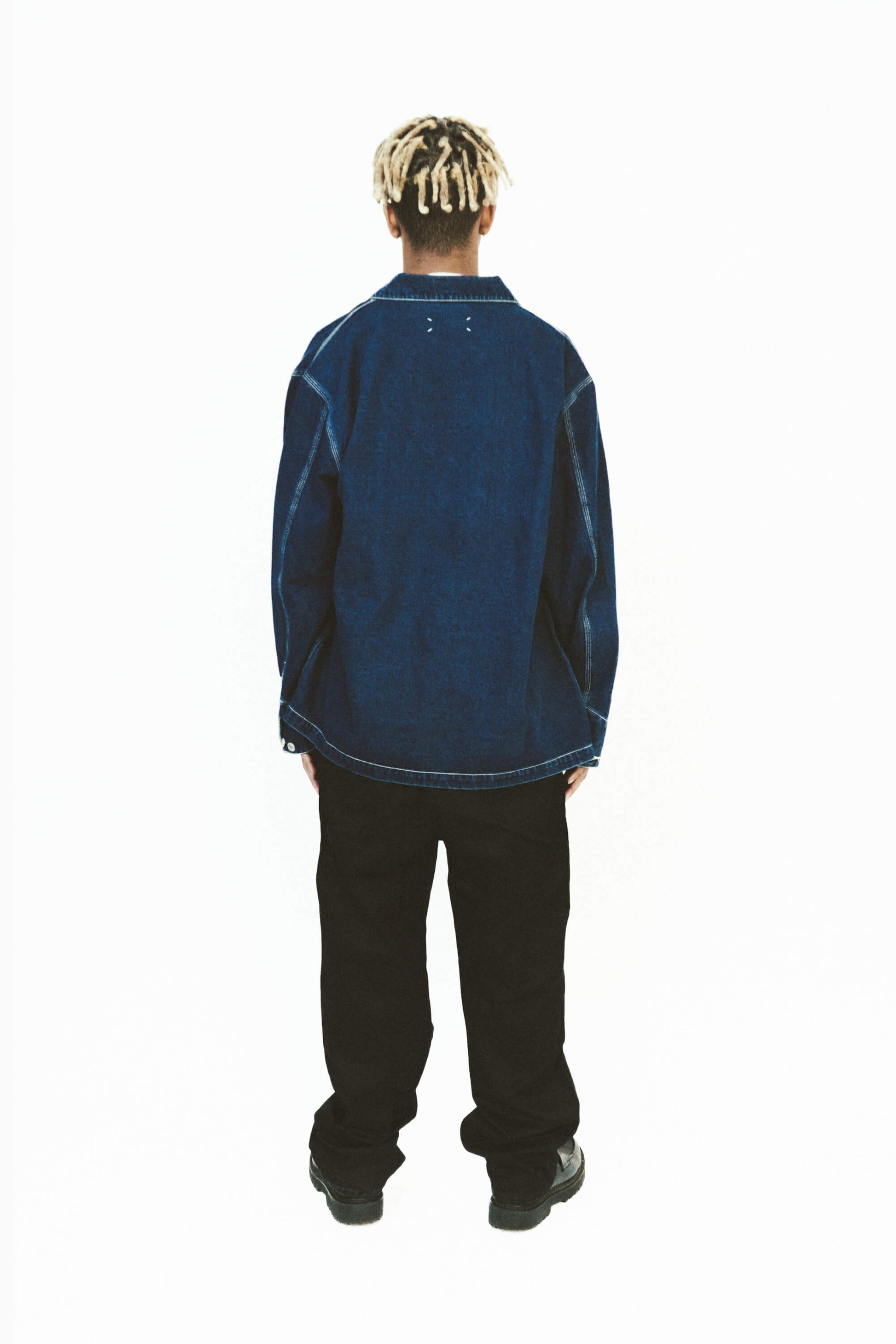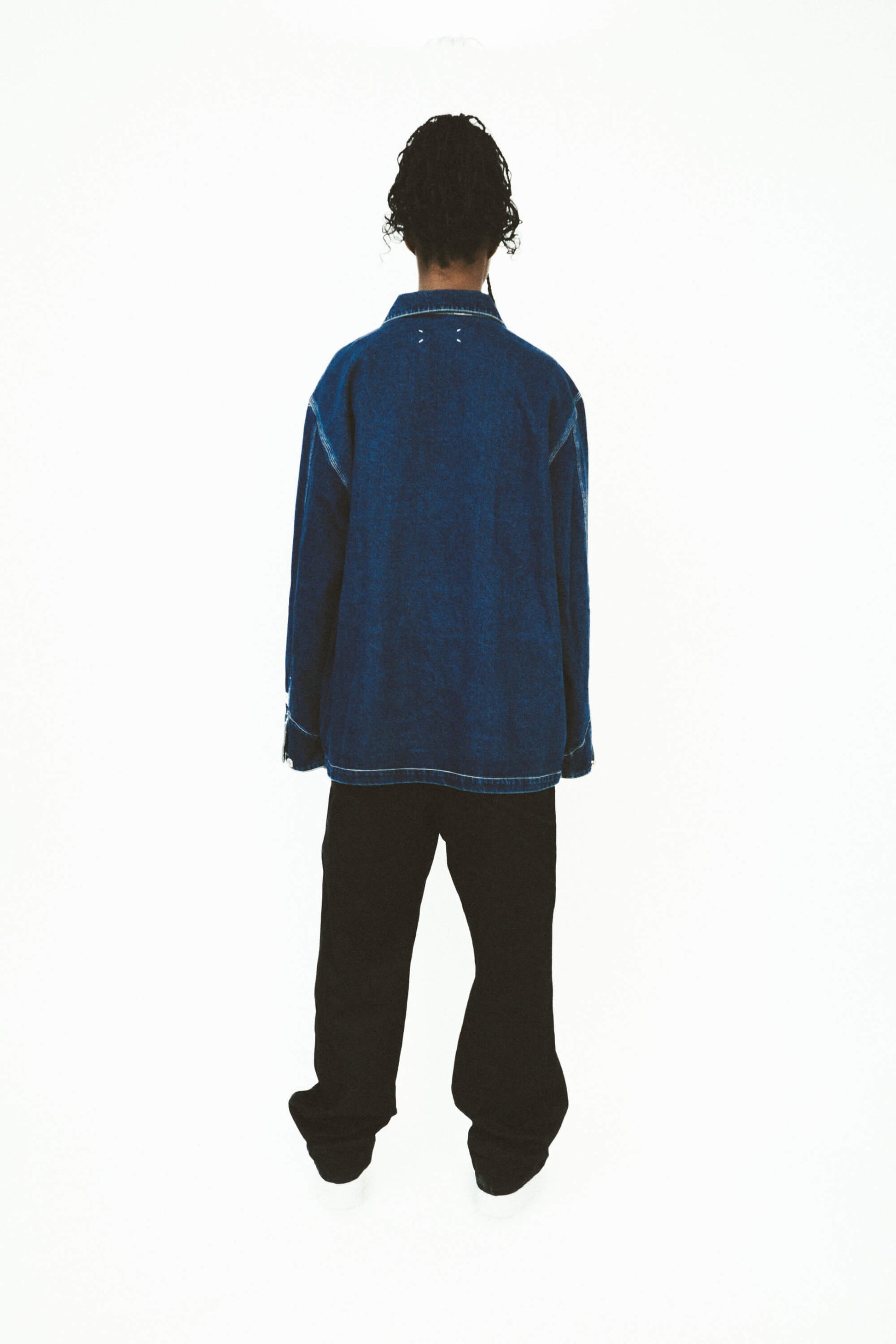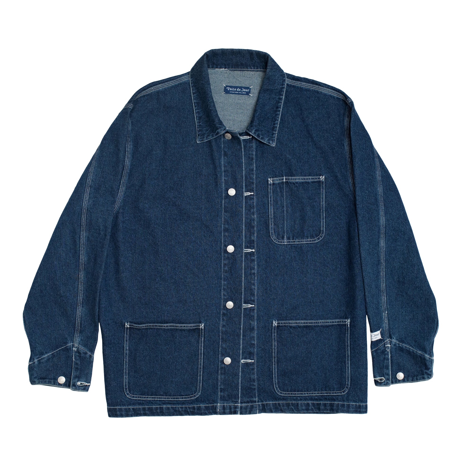 A 12oz indigo denim jacket with a loose fit and three-needle stitching. Features an internal hidden silk-screened motif of a 'medieval stabbing' print, along with a cuff logo inspired by Parisian tailors' branding. Functional pockets and adjustable cuffs complete the look.