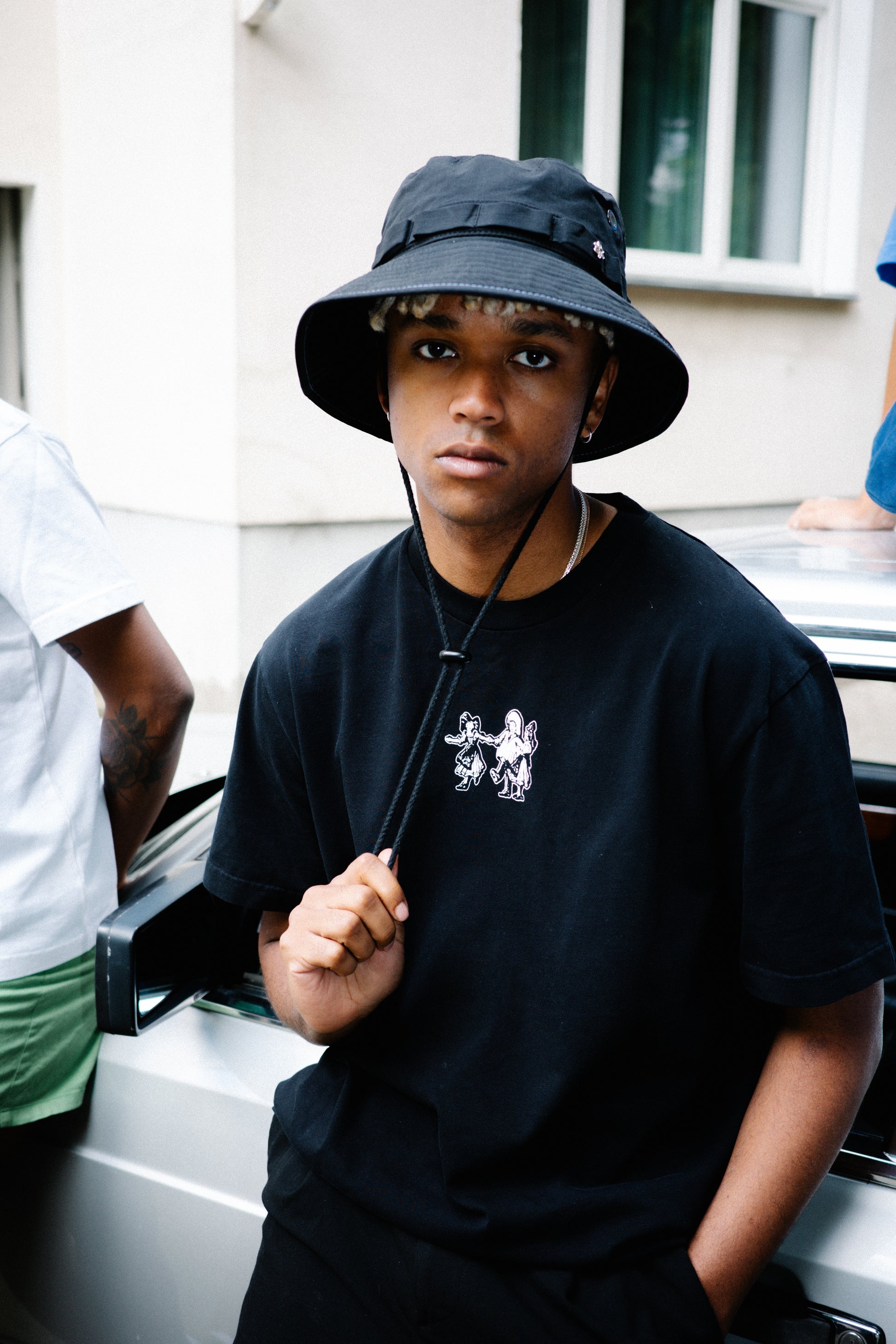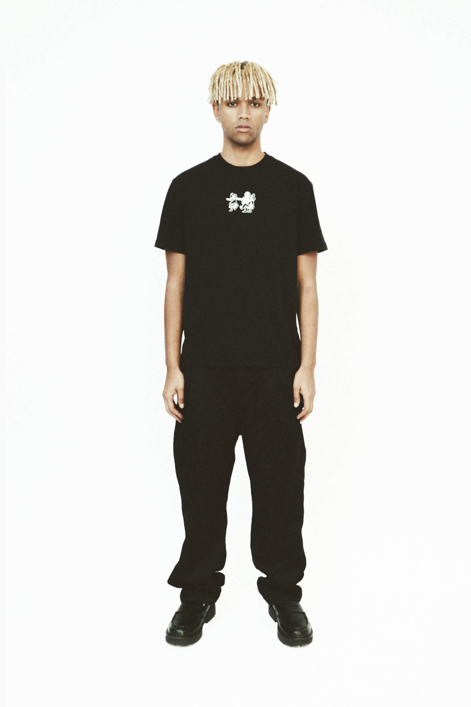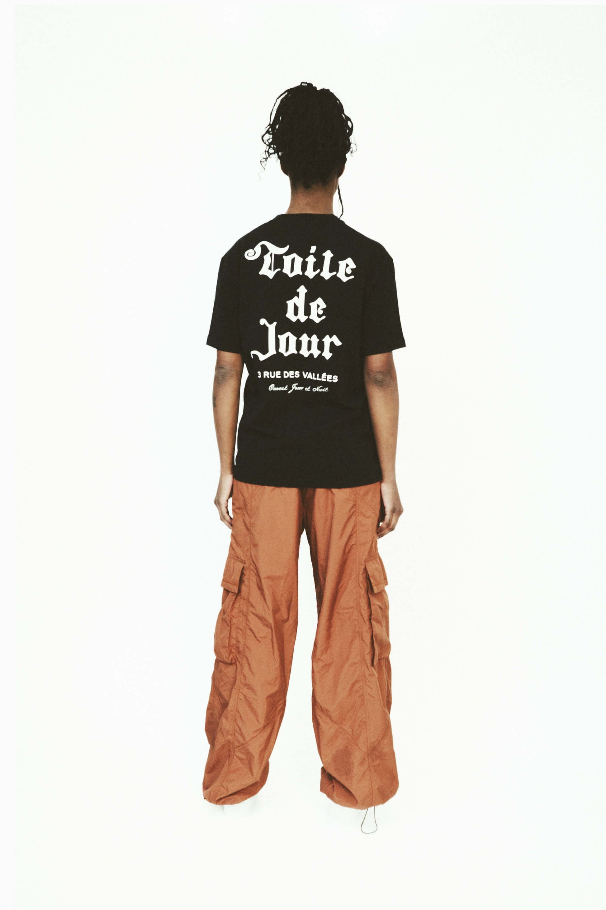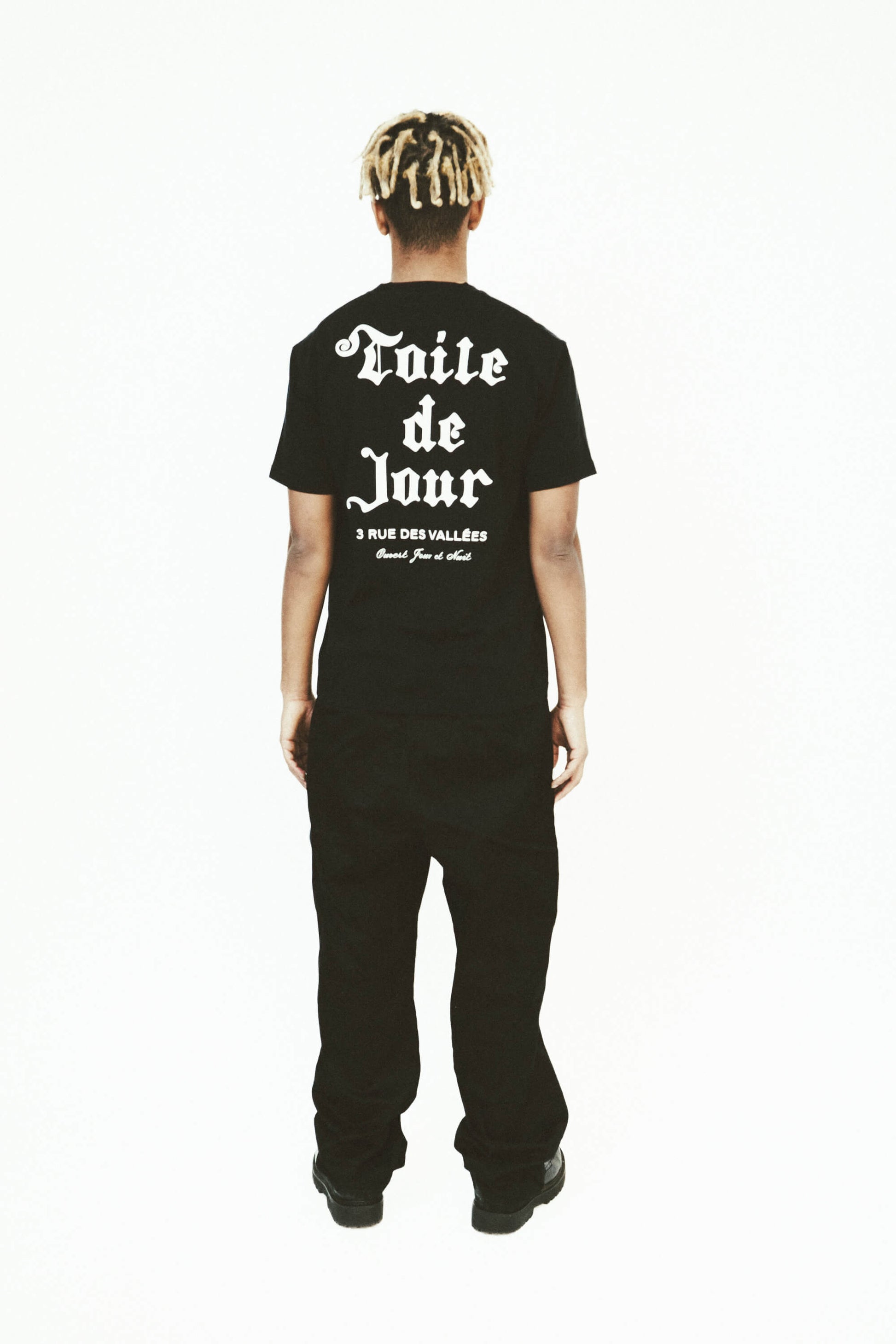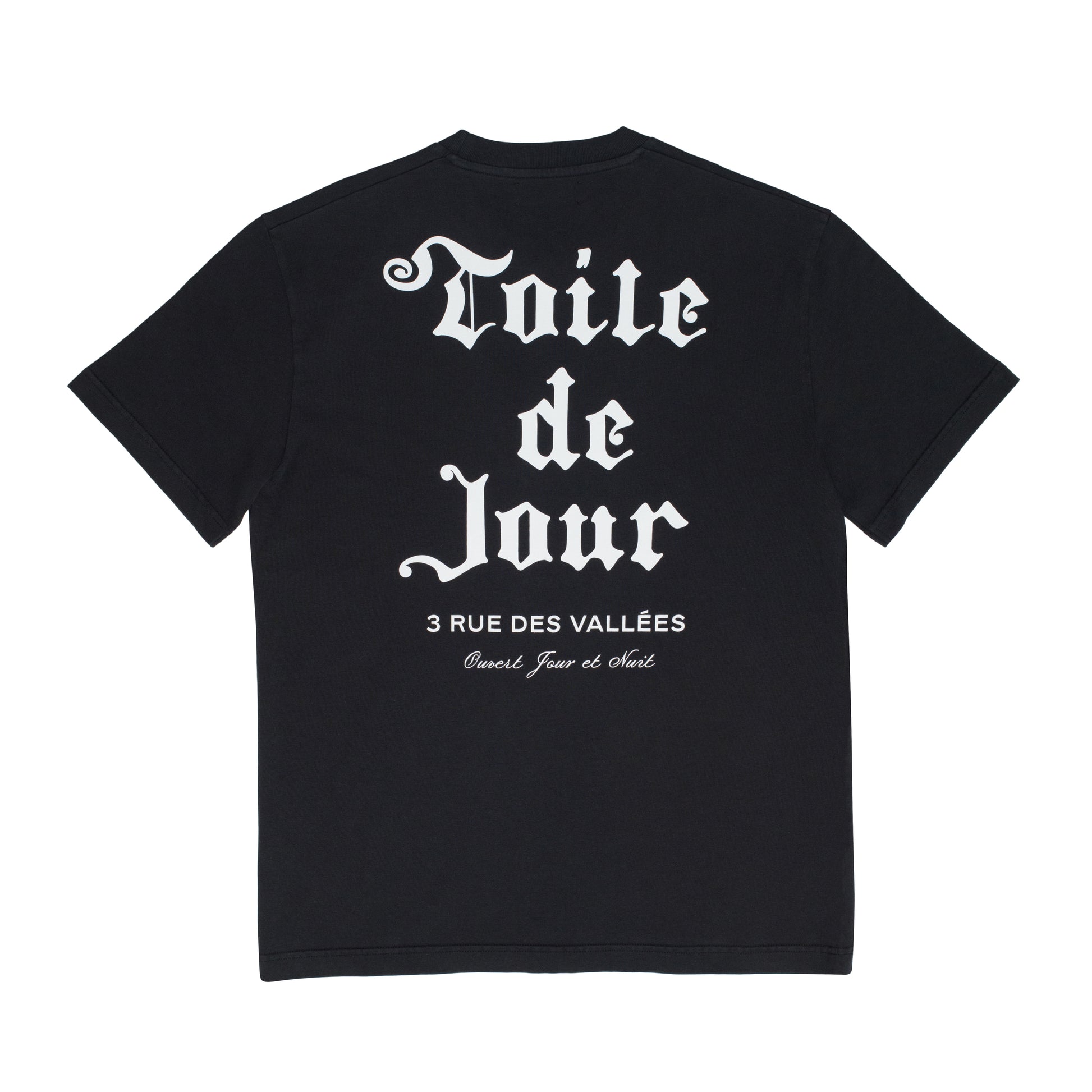 Crafted from 270gsm cotton, this heavyweight black tee features a double-sided silk-screen print. The front showcases the Toile De Jour logo, while the back is printed with the collection name, brand, and mantra in a traditional Alsatian font.